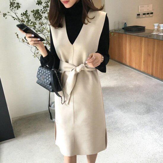 ワンピース ノースリーブワンピース オールインワン 秋冬 ゆったり 大きめ 体型カバー きれいめ カジュアル Vネック 膝丈 ウエストリボン ワンピース ノースリーブワンピース オールインワン