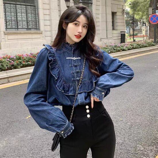 ブラウス デニムシャツ 長袖ブラウス 韓国風 大きめ 大きいサイズ カジュアル カジュアルスタイル 春 長袖 カジュアルトップス ブラウス デニムシャツ 長袖ブラウス 韓国風 大きめ 大きいサイズ