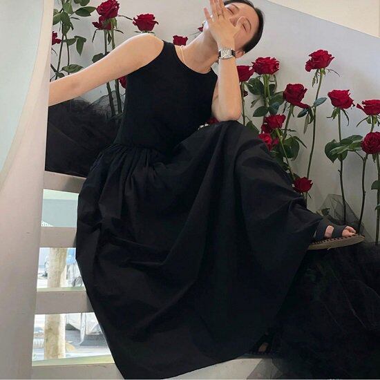 マキシ丈ワンピース ノースリーブ ロング丈ワンピース フレア ラウンドネック 夏ワンピ ウエスト切り替え Aライン マキシワンピ ロングワンピ マキシ丈ワンピース ノースリーブ ロング丈ワンピース