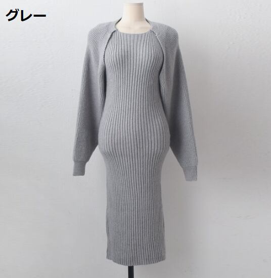 ニットワンピース レディース ニットカーディガン 2点セット ツーピース ノースリーブワンピース リブニット スリムフィットワンピース ボリューム袖 カジュアル シンプル 無地 おしゃれ お出かけ