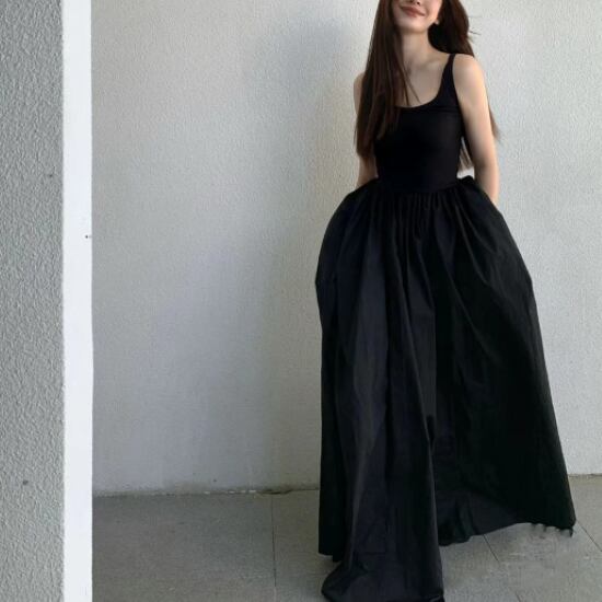 ロングワンピース レディース ワンピース ロング丈 黒 ブラック ハイウエスト ノースリーブ シンプル 無地 ラウンドネック シック カジュアル お出かけ おしゃれ きれいめ ロング丈ワンピース