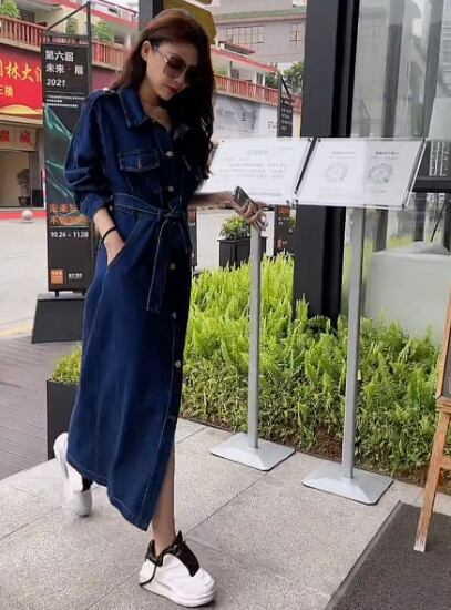 デニムワンピース レディース ワンピース ロングワンピース デニム 襟あり フロントボタン ウエストベルト ハイウエスト 長袖 ポロ襟 カジュアル お出かけおしゃれ ポケット シンプル ベーシック