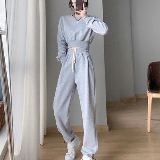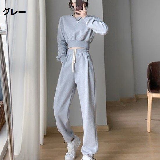 セットアップ レディース 上下セット 2点セット ツーピース スウェット トップス ボトムス トレーナー クロップド丈 ラウンドネック 長ズボン ウエストゴム シンプル 無地 カジュアル ルームウェア
