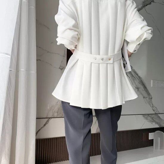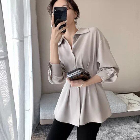 ブラウス レディース シャツ 長袖 ペプラム バックプリーツ ベルト Vネック スリムフィット ロングシャツ ロング丈 レトロ バックシャン きれいめ おしゃれ オフィス バックプリーツブラウス