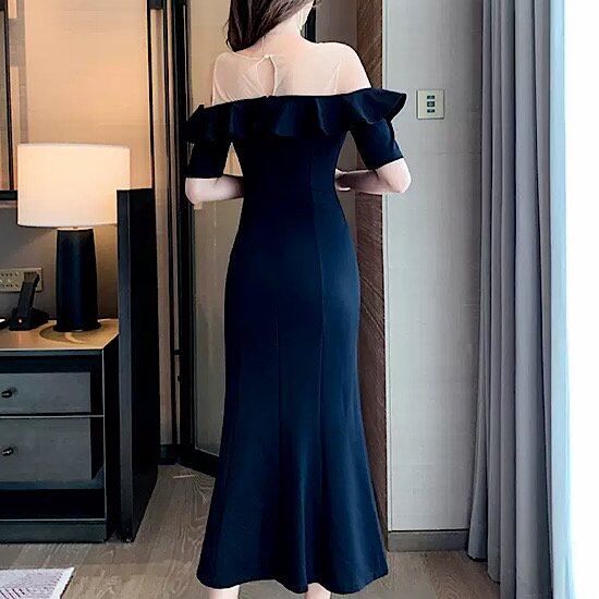 結婚式ドレス オフショルダー 無地 シンプル セクシー ミモレ丈 マーメイド 発表会 演奏会 レディース 結婚式 ステージ衣装 エレガント ウエディングドレス カラードレス イブニングドレス