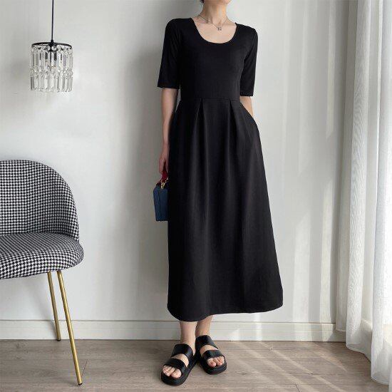 半袖ワンピース レディース ワンピース 半袖 ハイウエスト ロングワンピース シンプル 無地 Uネック 黒 ブラック カジュアル お出かけ おしゃれ 春夏 プルオーバー 半袖ワンピース レディース