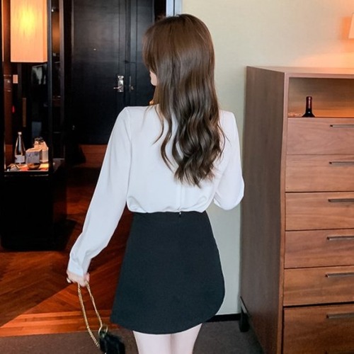 ブラウス レディース シャツ ボウタイ スカーフ リボン Vネック シフォン 長袖 無地 白 ホワイト グリーン レトロ クラシカル かわいい きれいめ 上品 清楚 おしゃれ オフィスコーデ