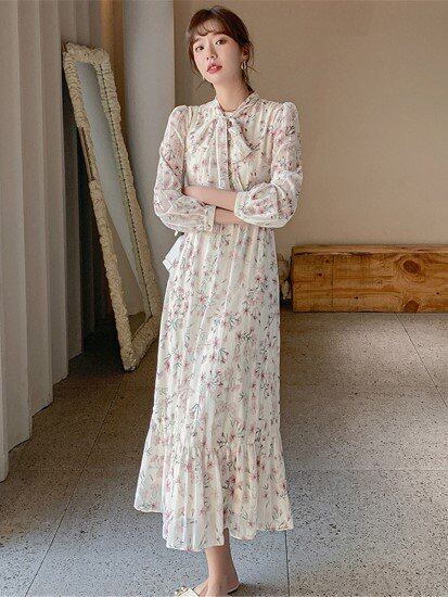 花柄ワンピース レディース ワンピース 小花柄 フラワー 総柄 長袖 リボンタイ ハイウエスト プルオーバー シフォンワンピース フェミニン カジュアル ガーリー お出かけ おしゃれ 春夏 ワンピース