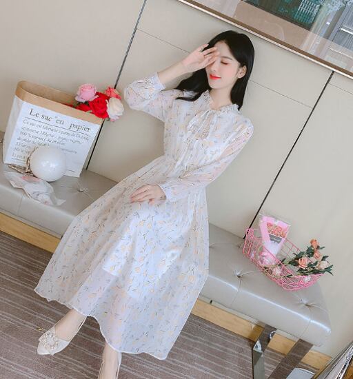 花柄ワンピース レディース シフォンワンピース ミドル丈ワンピース リボン 長袖 プルオーバー ハイウエスト フラワー フローラル カジュアル きれいめ フェミニン お出かけ おしゃれ 可愛い 春夏