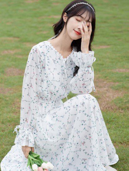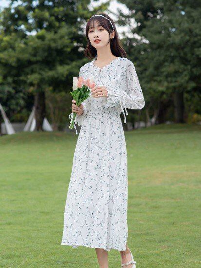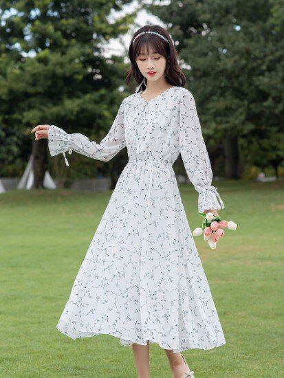 花柄ワンピース レディース ワンピース シフォンワンピース 総柄 プリントワンピース フラワー Vネック キャンディスリーブ 長袖 プルオーバー ハイウエスト フェミニン カジュアル きれいめ 春夏