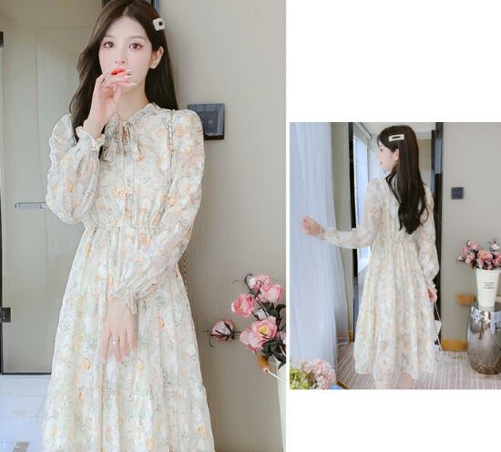 花柄ワンピース レディース ワンピース シフォンワンピース 長袖 リボン フリル ハイウエスト ミドル丈ワンピース カジュアル きれいめ フェミニン お出かけ おしゃれ デート 春夏 女性 ワンピース
