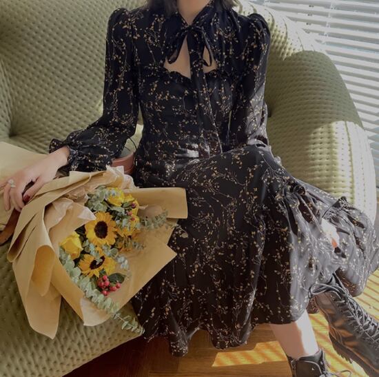 花柄ワンピース レディース ワンピース ミドル丈ワンピース 膝丈ワンピース 大きいサイズ フリル リボン 黒 ブラック フラワー 総柄 カジュアル お出かけ おしゃれ 長袖 プルオーバー ワンピース