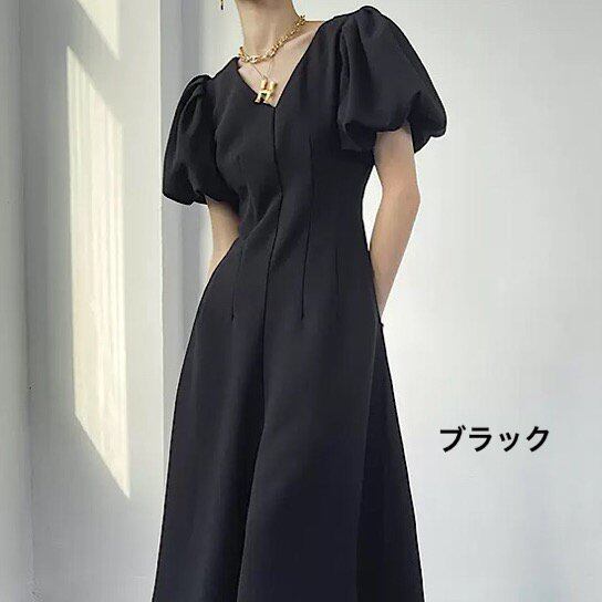 結婚式ドレス フレンチ パフスリーブ Vネック 半袖 ミモレ丈 発表会 演奏会 レディース 結婚式 ステージ衣装 エレガント ウエディングドレス カラードレス イブニングドレス 無地 シンプル