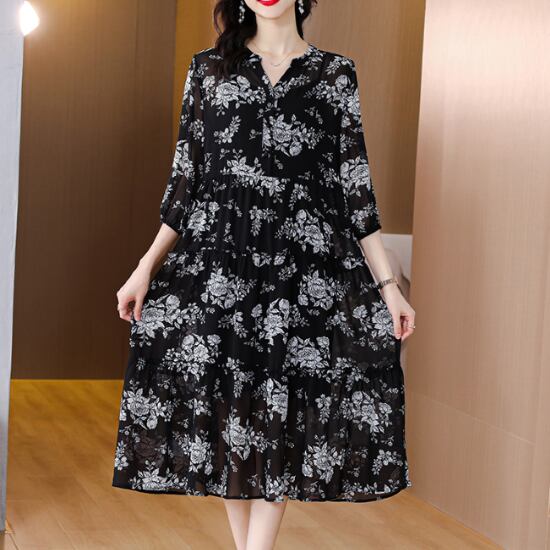 花柄ワンピース レディース ワンピース シフォンワンピース 七分袖ワンピース Vネック ゆったり ルーズシルエット 体型カバー ミドル丈 カジュアル お出かけ おしゃれ フラワー 総柄 ワンピース