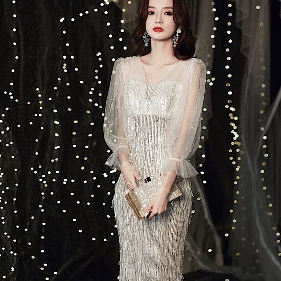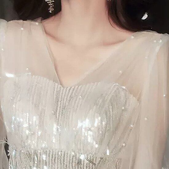 結婚式ドレス シースルー Vネック 長袖 透け感 キラキラ スリム 発表会 演奏会 レディース 結婚式 ステージ衣装 エレガント ウエディングドレス カラードレス イブニングドレス ラグジュアリー