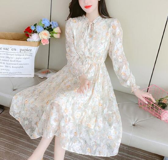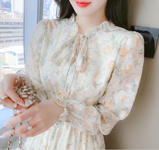 花柄ワンピース レディース ワンピース シフォンワンピース 長袖ワンピース 膝丈 ミドル丈ワンピース フリルネック リボン プルオーバー フェミニン カジュアル お出かけ おしゃれ 可愛い きれいめ