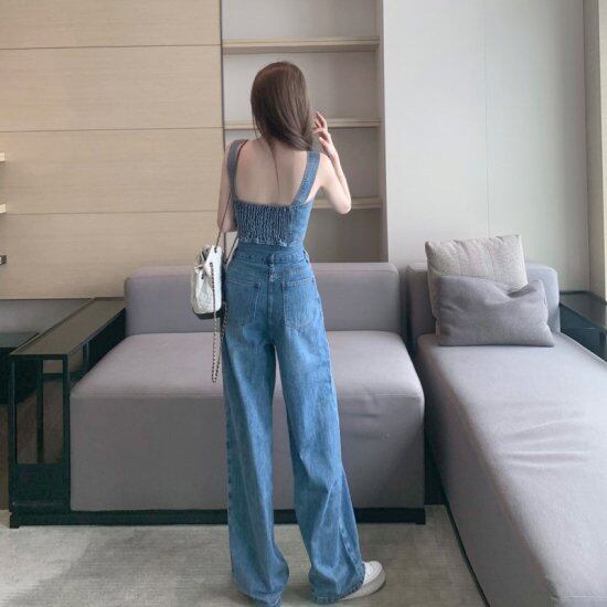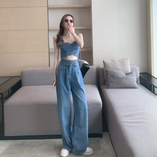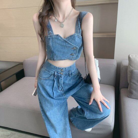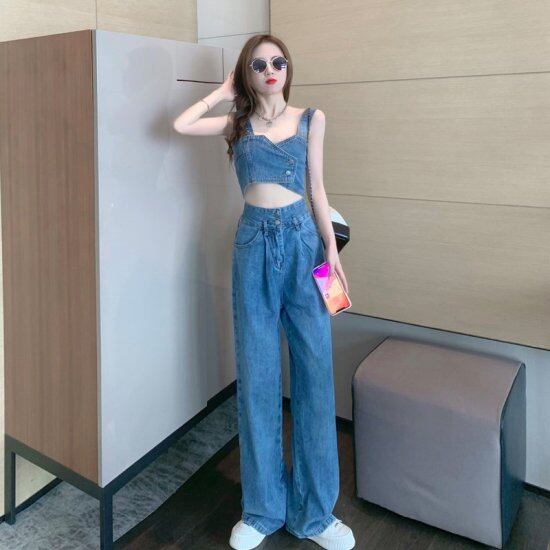 セットアップ レディース ワイドパンツ デニム ビスチェ キャミソール ショート丈 ベアトップス ハイウエストデニム ジーンズ 上下セット 肌見せ セクシー かわいい ガーリー 2点セット 春夏