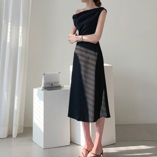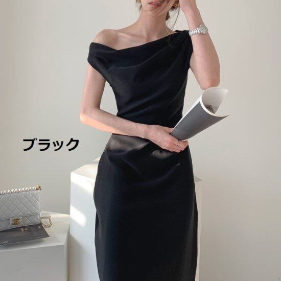ワンピース レディース オフショルダーワンピース ミディアム丈 ロング丈 ワンショルダー フレアワンピース ドレープネック ドレス 黒 ブラック シック きれいめ 上品 オフショル パーティー