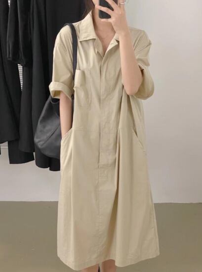 半袖ワンピース レディース ワンピース シャツワンピース 膝丈ワンピース ミドル丈 シンプル 無地 カジュアル お出かけ おしゃれ 半袖 襟あり ボタン ポロ襟 ポケット ゆったり ルーズ ワンピース