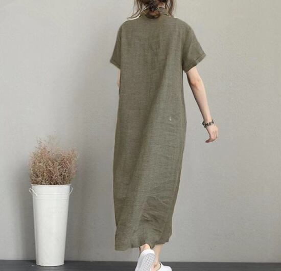 シャツワンピース レディース ワンピース ロングワンピース 半袖ワンピース ロング丈 ボタン 襟あり ポロ襟 シンプル 無地 ゆったり ルーズ カジュアル お出かけ おしゃれ リネンワンピース 春夏