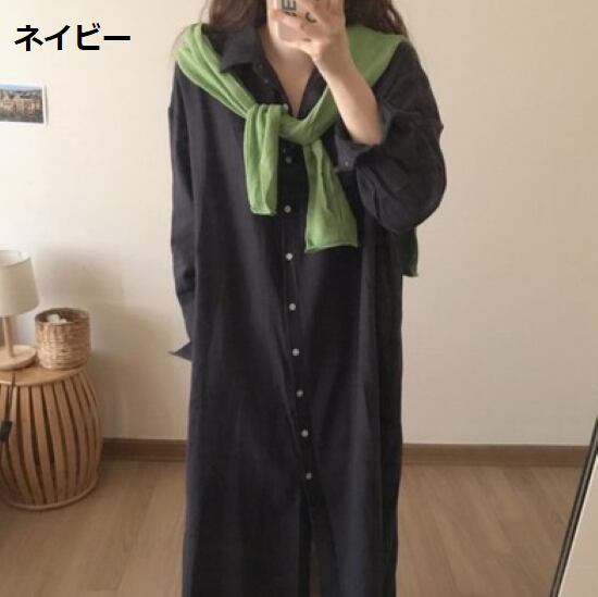 シャツワンピース レディース ワンピース 長袖ワンピース ロング丈 ゆったり 体型カバー フロントボタン 襟あり ポロ襟 カジュアル シンプル 無地 お出かけ ベーシック コットンリネン シャツワンピ
