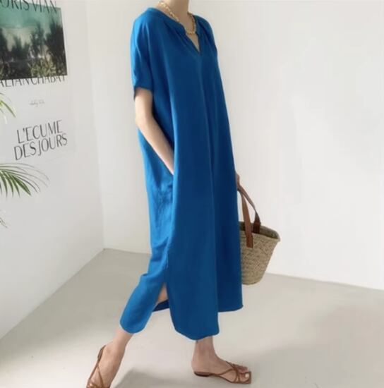 半袖ワンピース レディース ワンピース ロングワンピース ラウンドヘム ロング丈 Vネック シンプル 無地 ゆったり ルーズ 体型カバー カジュアル お出かけ 春夏 コットン 綿 プルオーバー 女性