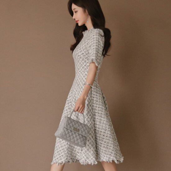 ワンピース レディース 半袖ワンピース ツイード ノーカラー 襟なし スタンドカラー 五分袖 Aラインワンピース フレアワンピース レトロ クラシカル かわいい きれいめ 上品 おしゃれ デート