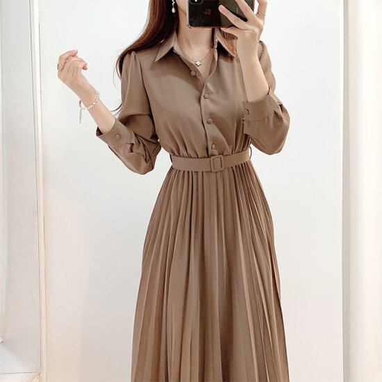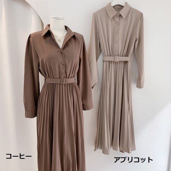 ワンピース レディース シャツワンピース プリーツワンピース ベルト 長袖 Vネック ミディアム丈 ミモレ丈 ロング丈 ブラウン レトロ クラシカル きれいめ 上品 シック おしゃれ オフィスコーデ