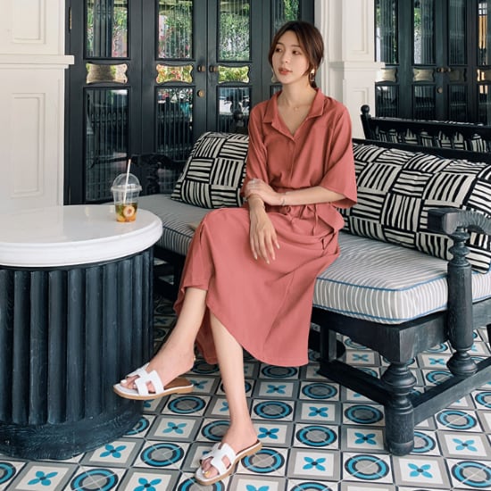 シャツワンピース レディース ワンピース 五分袖ワンピース フロントボタン ウエストリボン 大きいサイズ シンプル 無地 シフォンワンピース カジュアル お出かけ ポロ襟 ゆったり ルーズ 春夏