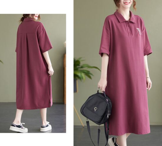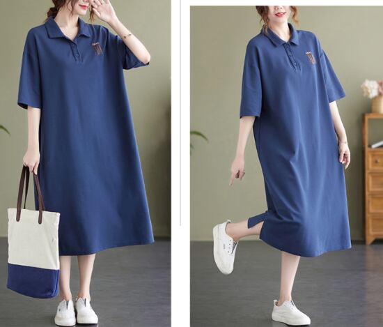 半袖ワンピース レディース ワンピース ミドル丈ワンピース 半袖 襟あり ポロ襟 ゆったり ルーズ ワンポイント カジュアル お出かけ プルオーバー コットン 綿 シャツワンピース 春夏 女性