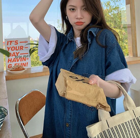 デニムワンピース レディース ワンピース 半袖ワンピース カジュアル お出かけ フロントボタン 襟あり ポロ襟 ミドル丈ワンピース シンプル 無地 ゆったり ルーズ デニムワンピ ブルー 青 春夏