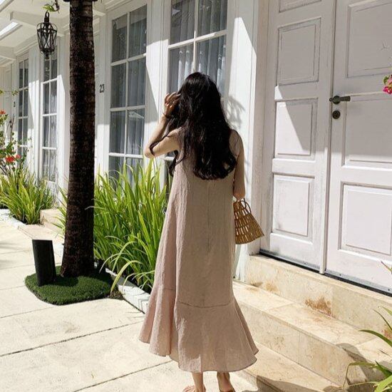 ワンピース レディース ノースリーブワンピース リネンブレンド マーメイド Aライン リネンコットン 透け感 ラウンドネック フリルワンピース レトロ クラシカル かわいい きれいめ リゾート 夏