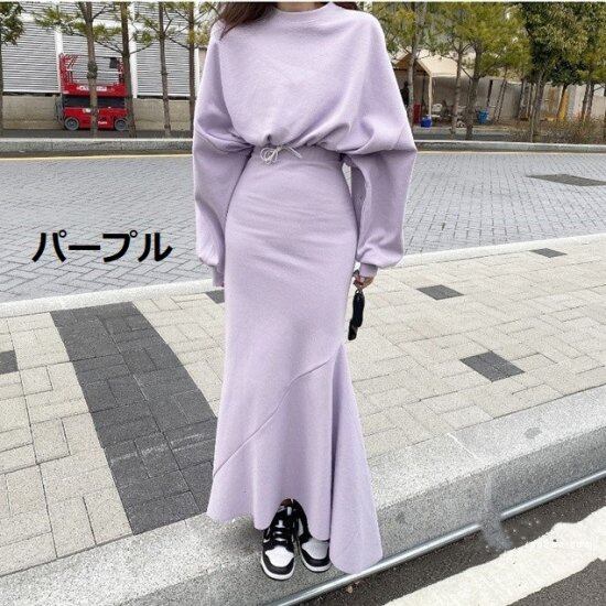 セットアップ レディース スカートセット 長袖 プルオーバー トレーナー ショート丈 クロップド丈 マーメイドスカート ロングスカート 上下セット かわいい カジュアル ガーリー 無地 コットン