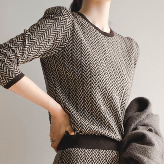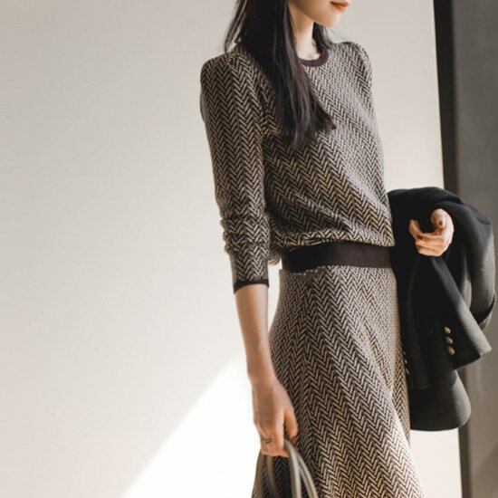 セットアップ レディース スカートセット ニット ヘリンボーン 長袖 プルオーバー ラウンドネック フレアスカート ミディアム丈 ミモレ丈スカート ニットセット Aライン 上品 大人 上下セット