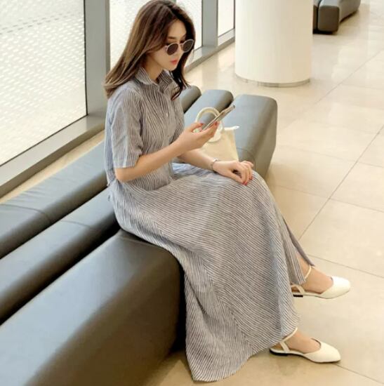 シャツワンピース レディース ワンピース ロングワンピース フロントボタン ストライプ 襟あり 半袖ワンピース コットンリネン 綿麻 ナチュラル カジュアル お出かけ おしゃれ シャツワンピ 女性