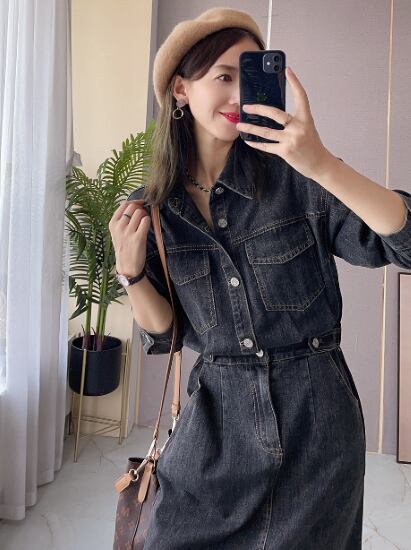 デニムワンピース レディース ワンピース ミドル丈ワンピース 襟あり ポロ襟 ボタン ポケット プルオーバー カジュアル お出かけ おしゃれ ハイウエスト ウエストマーク デニムワンピ 女性 春夏