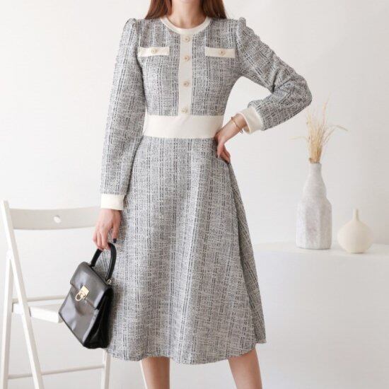 ワンピース レディース フレアワンピース Aラインワンピース ツイード ハイウエスト 長袖 配色ワンピース ブラック アイボリー かわいい きれいめ 上品 清楚 おしゃれ オフィス デート お呼ばれ
