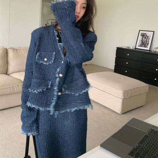 セットアップ レディース デニム スカートセット フリンジ ノーカラージャケット Vネックジャケット ロングスカート タイトスカート 上下セット スーツ きれいめ カジュアル オフィスコーデ