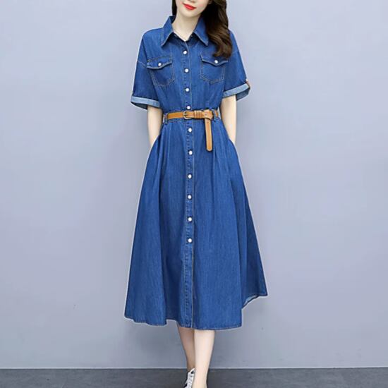 デニムワンピース レディース ワンピース シャツワンピース ミドル丈ワンピース 襟あり ポロ襟 フロントボタン 半袖 Aラインスカート カジュアル お出かけ おしゃれ 無地 胸ポケット ハイウエスト
