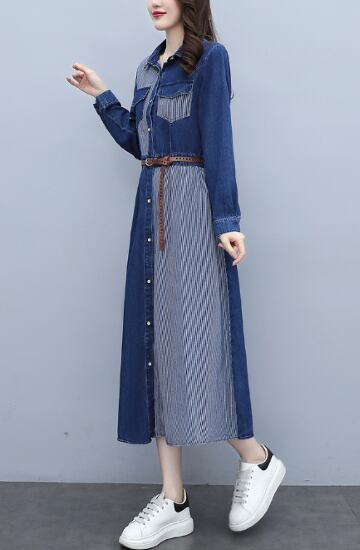 デニムワンピース レディース ワンピース ミドル丈ワンピース シャツワンピース 長袖ワンピース フロントボタン 襟あり ポロ襟 切り替え ストライプ 無地 ハイウエスト カジュアル お出かけ 女性