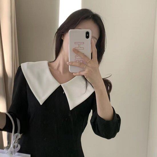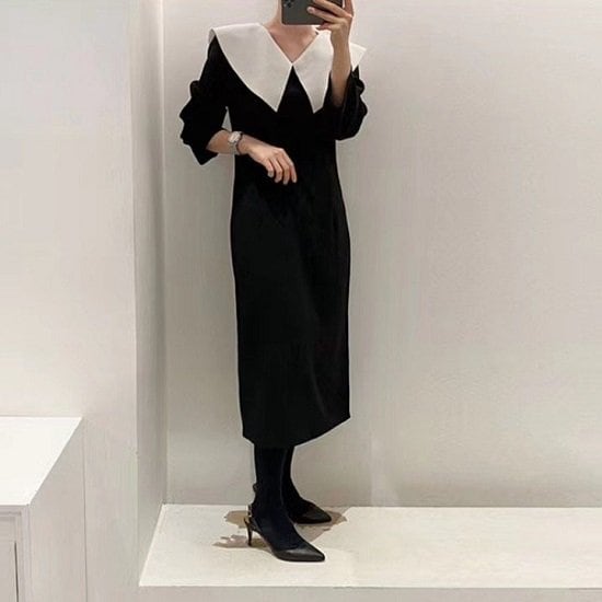 ビッグカラーワンピース 七分袖 ツートーン Vライン Vネック 襟 ビッグカラー ワンピース フェミニン お呼ばれ ボックス ロング丈 膝下 パフスリーブ ビッグカラーワンピース 七分袖 ツートーン