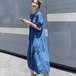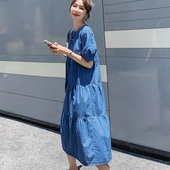 デニムワンピ ティアードワンピ ロング丈 半袖 ぽわん袖 リボン キーネック 大きめ ロングワンピ デニム スリットネック 夏ワンピ ジーンズ カジュアル デニムワンピ ティアードワンピ ロング丈