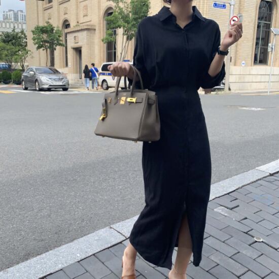 シャツワンピース レディース ワンピース ロングワンピース 七分袖 シンプル 無地 スリムフィット 細身 フロントボタン コットンリネン 綿麻 ハイウエスト カジュアル お出かけ きれいめ おしゃれ