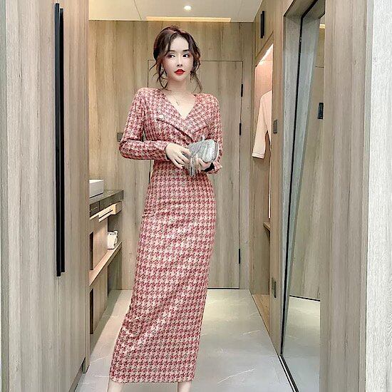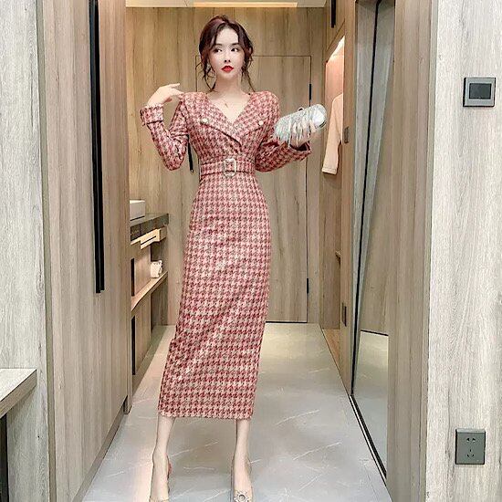結婚式ドレス スーツ風 襟付き 長袖 フレンチスタイル 格子縞 ミモレ丈 ハイウエスト 発表会 演奏会 レディース 結婚式 ステージ衣装 エレガント カラードレス スリムフィット ベルト付き