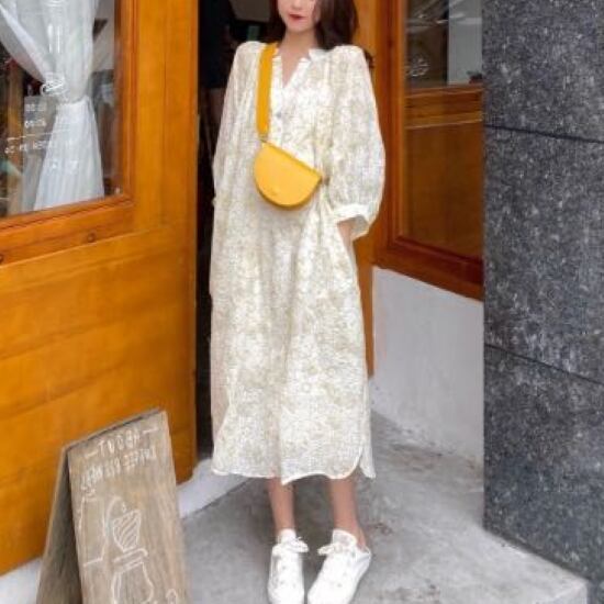花柄ワンピース レディース ワンピース ミドル丈ワンピース シフォンワンピース Vネック ボリューム袖 七分袖 総柄 フラワー カジュアル お出かけ おしゃれ 春夏 ゆったり 体型カバー ルーズ 女性