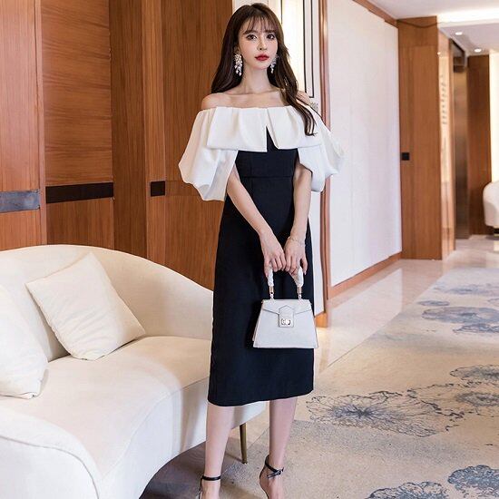 オフショルダー ドレス バイカラーワンピース タイトワンピ 膝下 バイカラー 胸元フリル オフショル 黒 ワンピース 半袖 バルーン袖 オフショルダー ドレス バイカラーワンピース タイトワンピ