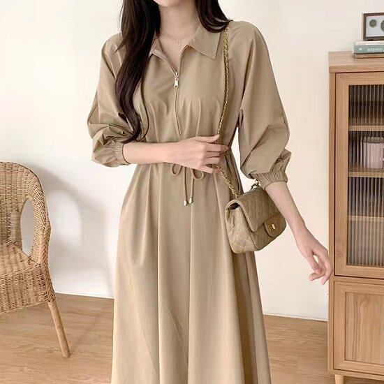 ハーフジップ ワンピース ウエストマーク Aライン 襟付き ジップ ロング丈 膝下 ロングワンピ 七分袖 バルーン袖 ボリューム袖 カジュアル ストリング ハーフジップ ワンピース ウエストマーク