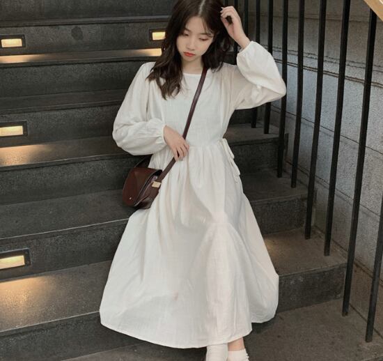 シフォンワンピース レディース ワンピース 長袖ワンピース ミドル丈ワンピース ラウンドネック シンプル 無地 カジュアル フェミニン お出かけ ホワイト 白 プルオーバー 女性 春夏 シフォンワンピ