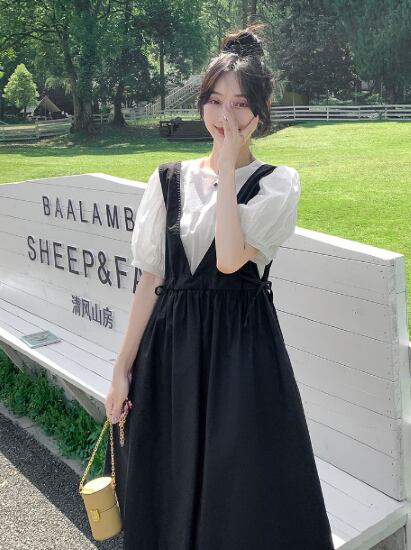 セットアップ レディース 半袖トップス パフスリーブ ノースリーブワンピース ハイウエスト 2点セット 重ね着 レイヤードスタイル ラウンドネック コントラストカラー 膝丈ワンピース Aラインスカート