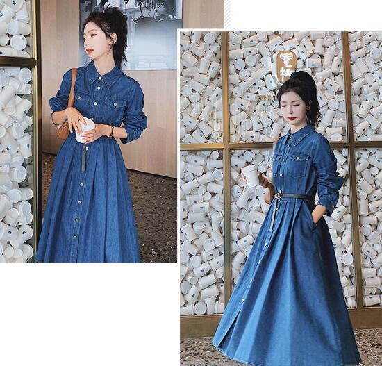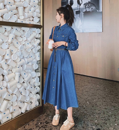デニムワンピース レディース ワンピース シャツワンピース Aラインスカート ハイウエスト ポロ襟 長袖ワンピース フロントボタン シンプル 無地 カジュアル お出かけ おしゃれ デニムワンピ 女性
